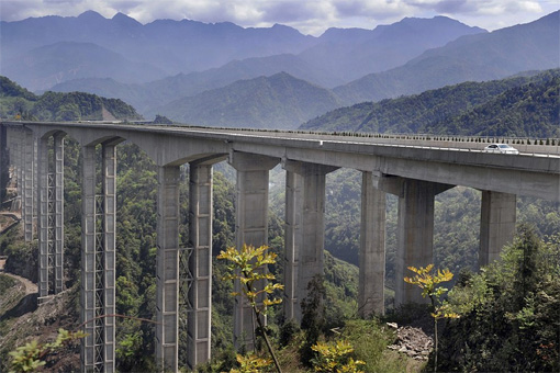 4、干海子特大橋,在國(guó)內(nèi)公路建設(shè)史上首創(chuàng)鋼管桁架連續(xù)梁輕型橋梁結(jié)構(gòu),減輕結(jié)構(gòu)自重55%以上,減少樁基數(shù)量近一半,是適合高地震烈度山區(qū)復(fù)雜地形的橋型式,大橋長(zhǎng)1811米,最高鋼管格構(gòu)橋墩達(dá)117米,是世界第一座全鋼管混凝土桁架梁橋,其桁架梁長(zhǎng)度和鋼管格構(gòu)墩高度均為世界第一。