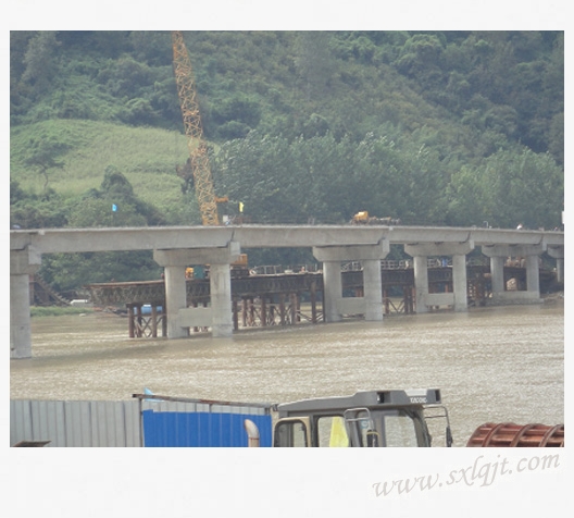 段家營大橋全長420米,上部結(jié)構(gòu)為預應(yīng)力砼先簡支后連續(xù)橋梁,下部結(jié)構(gòu)為柱式橋墩、肋板式臺、鉆孔灌注樁基礎(chǔ)。該橋位于石泉大水庫上游,跨越漢江,由于該橋受石泉水庫蓄水影響,正常蓄水深達11米以上。該橋樁基礎(chǔ)采用鋼管樁平臺進行施工,共搭設(shè)剛便橋320米,寬6米,施工平臺6個。大橋安裝過程中,針對場地狹小、預制場無移動門架的情況,項目部提前研究、制訂安裝方案,反復論證,確保了大橋順利合攏。